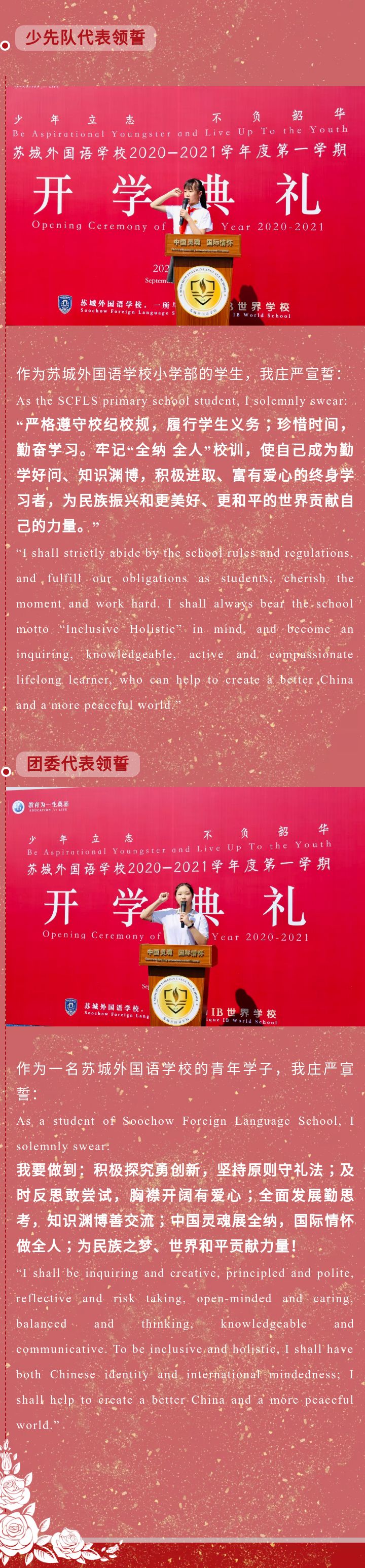 典禮上,小學部大隊長王璟雯和中學部學生主席陳璟涑兩位同學分別帶領小學部和中學部作了新學期宣誓。