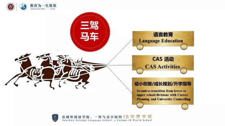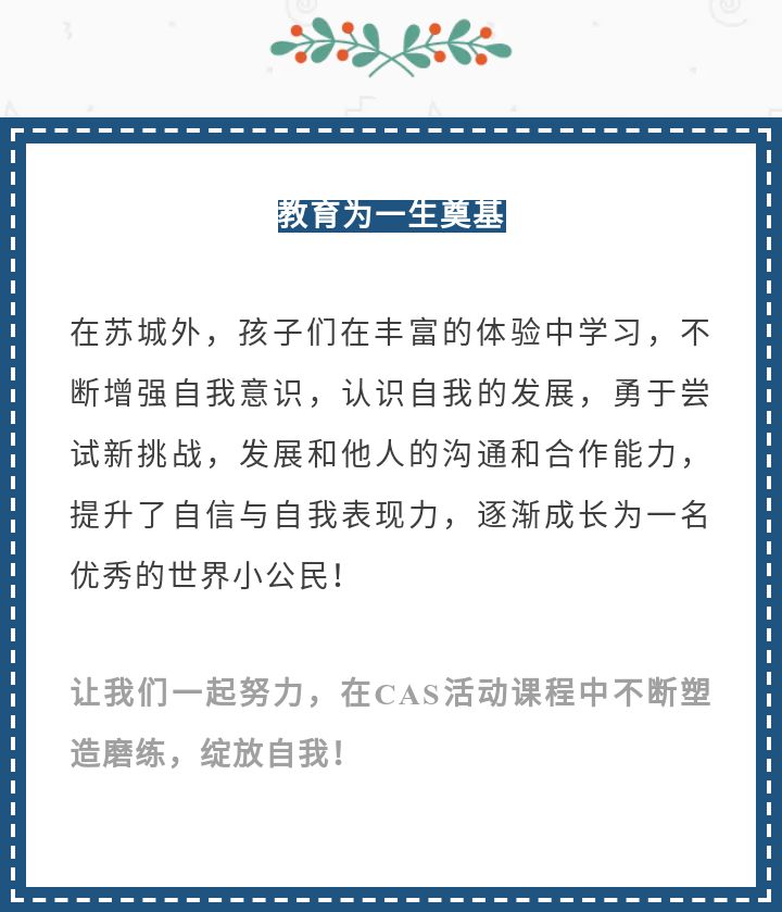 CAS活動是蘇城外國語學校“三駕馬車”之一,旨在加強科技與藝術創造、體育與健康生活,社區服務和自我認同教育,培養全面、均衡發展的個體,實施“全納”和“全人”教育,為每一位學生提供量身定制最適合的教育。