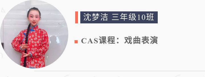 我在CAS戲曲表演課堂中學習唱、念、做、打四項戲曲基本功,學到了很多戲曲方面的知識,戲曲的文化底蘊深深的吸引了我。我與小伙伴一起參加了戲曲演出,如《紅燈記》、《賣水》、《梨花頌》等。