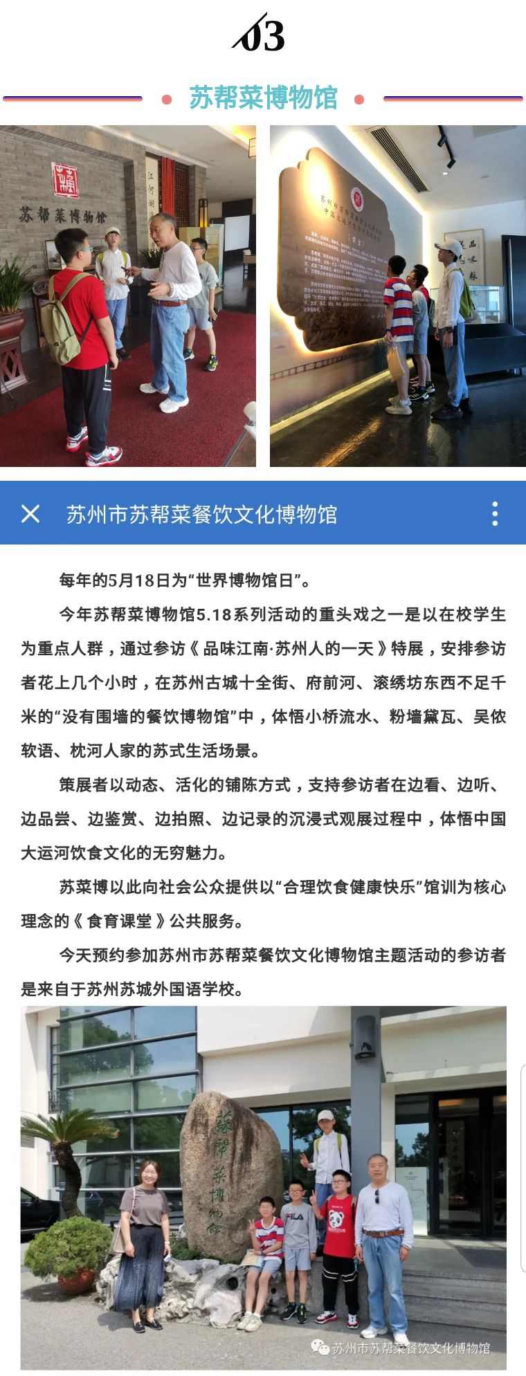 ▲ 蘇州市蘇幫菜餐飲文化博物館官方微信就SCFLS學子探究活動作了專題報道