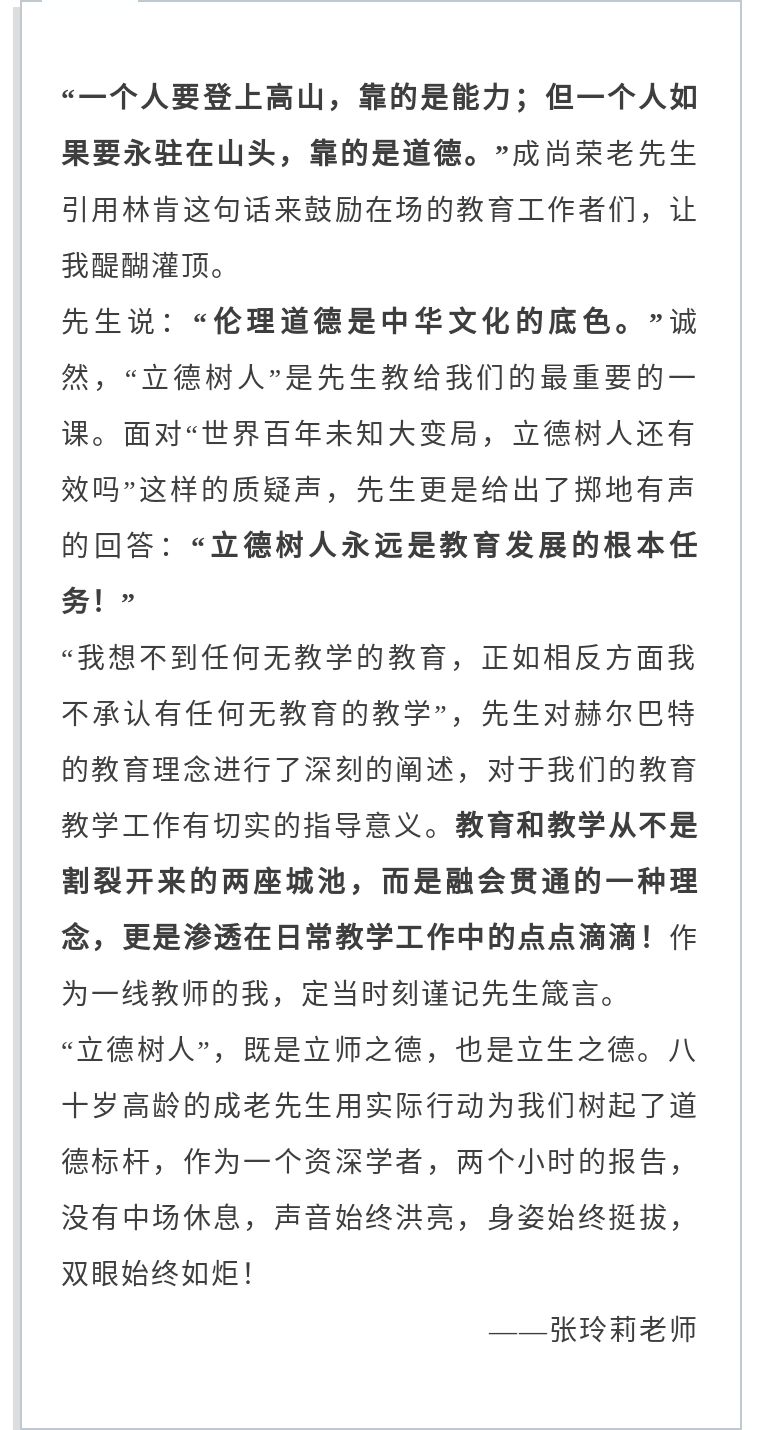 成尚榮先生在談及當前教育領域的種種話題,如數家珍,旁征博引,字字珠璣,博雅從容的氣度令人嘆服。先生風骨,吾輩楷模,成老先生用跨越大半個世紀的閱讀和思考所賦予的力量,在這個時代努力地發出自己的“聲音”。