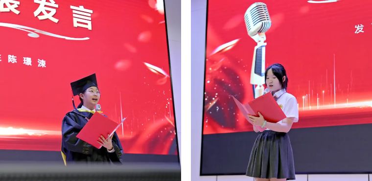 ▲ 家長代表中考項目王澤濤媽媽、國際項目夏玉涵媽媽發言,兩位家長表達了這三年來對蘇城外的肯定與信任,對所有辛勤付出的老師們的感激之情。